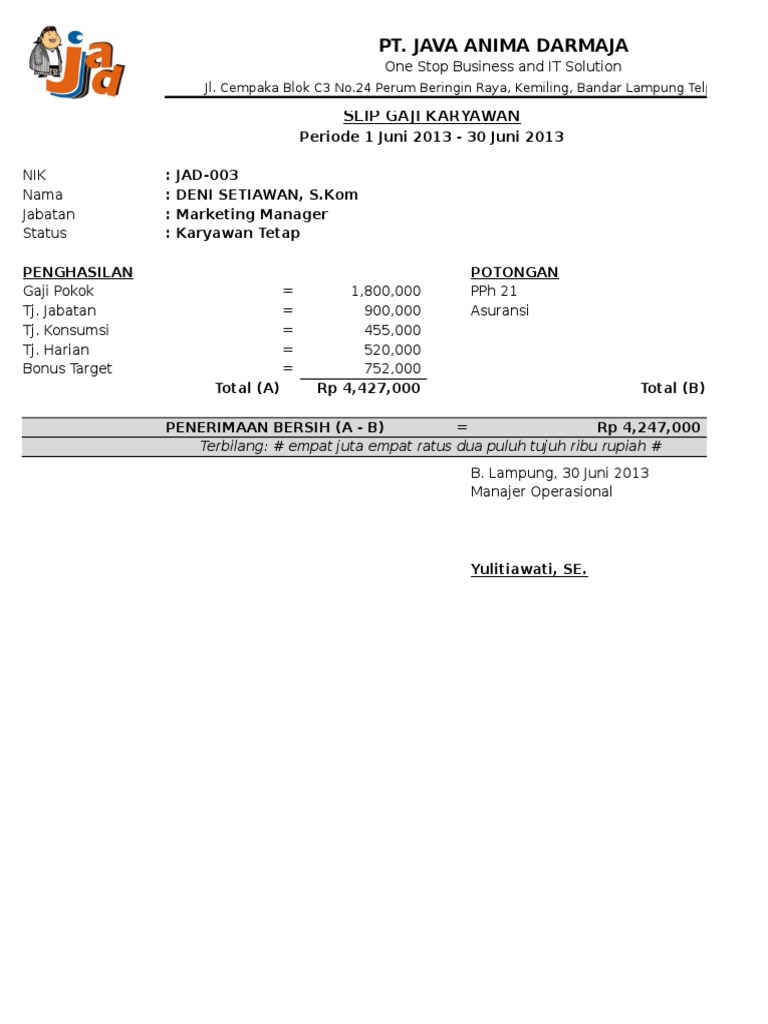 Pasti sangat bahagia mendapatkan gaji dengan usaha kita sendiri apalagi untuk memenuhi kebutuhan keluarga. #arluxmancara membuat slip gaji berdasarkan pembacaan dari tabel data gaji karyawan dengan menggunakan microsoft excel. Slip gaji ini juga menerangkan berapa total take home pay yang diterima oleh karyawan. Jika perusahaan sudah memiliki aplikasi pengelolaan gaji karyawan maka pencetakan slip gaji akan sangat mudah dilakukan. 04 slip gaji pegawai dan tenaga kependidikan periode bulan januari 2014 nik nama jabatan status penghasilan gaji pokok tj.000 = = total (b) penerimaan bersih (a.550.000 rp 3.